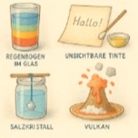 Gemeinsam führen wir aufregende Experimente mit alltäglichen Materialien durch: Mit Backpulver und anderen geheimen Zutaten lassen wir einen bunten Vulkan ausbrechen und zaubern uns einen Regenbogen ins Glas. Außerdem schreiben wir mit unsichtbarer Tinte – und lüften das Geheimnis dahinter! Und als krönender Abschluss wartet noch ein Überraschungsexperiment auf dich. Was da wohl passiert? Lass dich überraschen! Alle Experimente führst du natürlich selbst durch – mit guter Anleitung und jeder Menge Spaß!