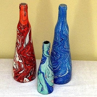 Tropfen, tauchen, fertig! In nur wenigen Sekunden entstehen wunderschöne marmorierte Blumenvasen. In einen Behälter werden verschiedene Kaltkeramikfarben getropft und zu einem Muster gezogen. Dann tauchen wir verschieden große Glasflaschen langsam ein. Es entstehen wunderschöne Muster.